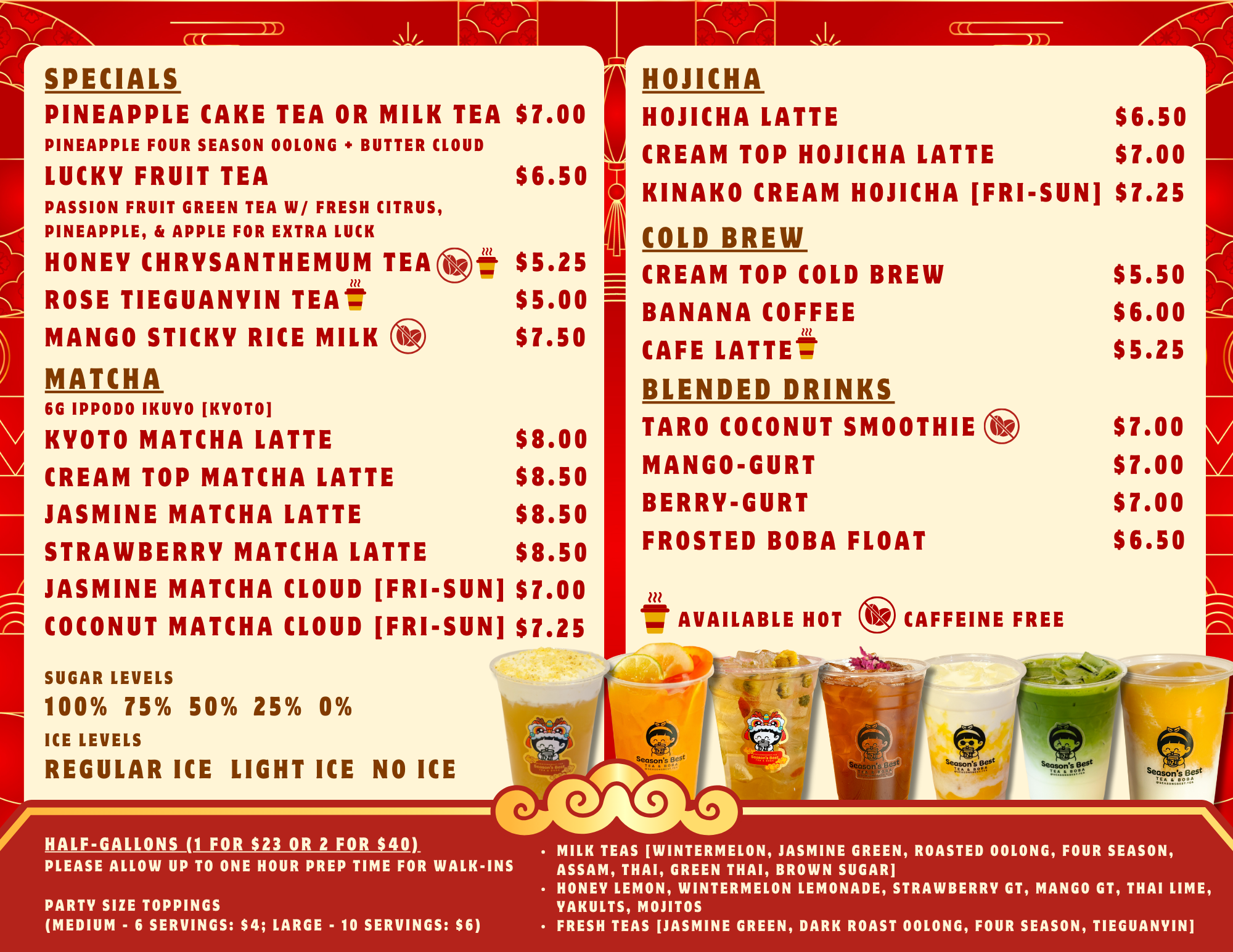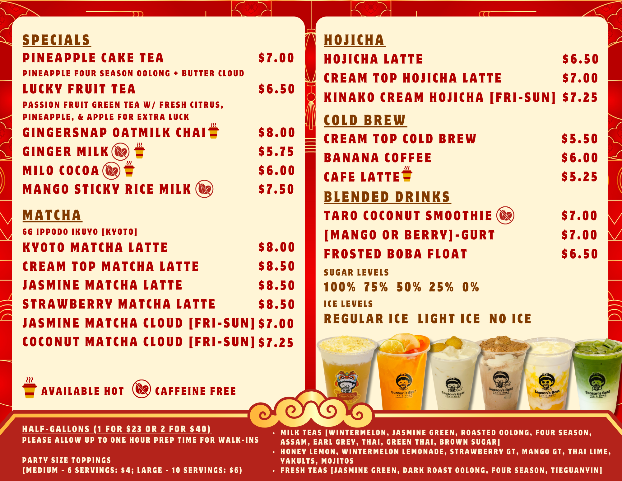 Exceptions: our wintermelon syrup, brown sugar syrup, and longan honey syrup are sourced from suppliers. All tea bases and coffee are brewed in-house.